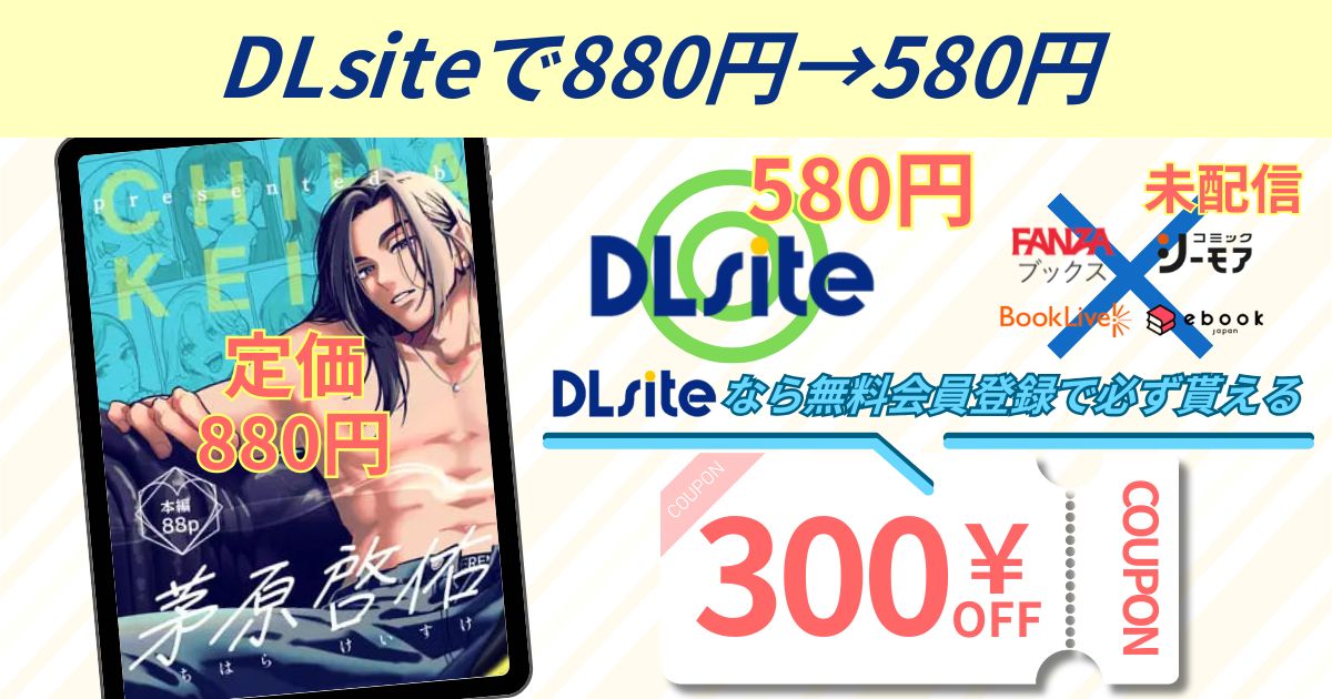 その点、DLsiteでは、最初にご利用いただくクーポンを使うと、定価880円の『茅原啓佑の×恋』が580円で読破でき、安心して経済的に満喫できますよ!